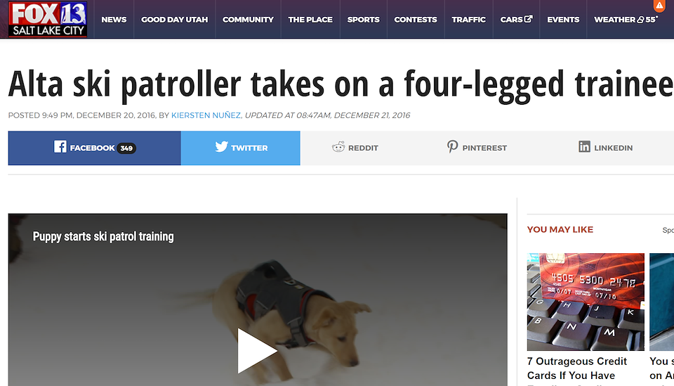 News coverage. http://fox13now.com/2016/12/20/alta-ski-patroller-takes-on-a-four-legged-trainee/